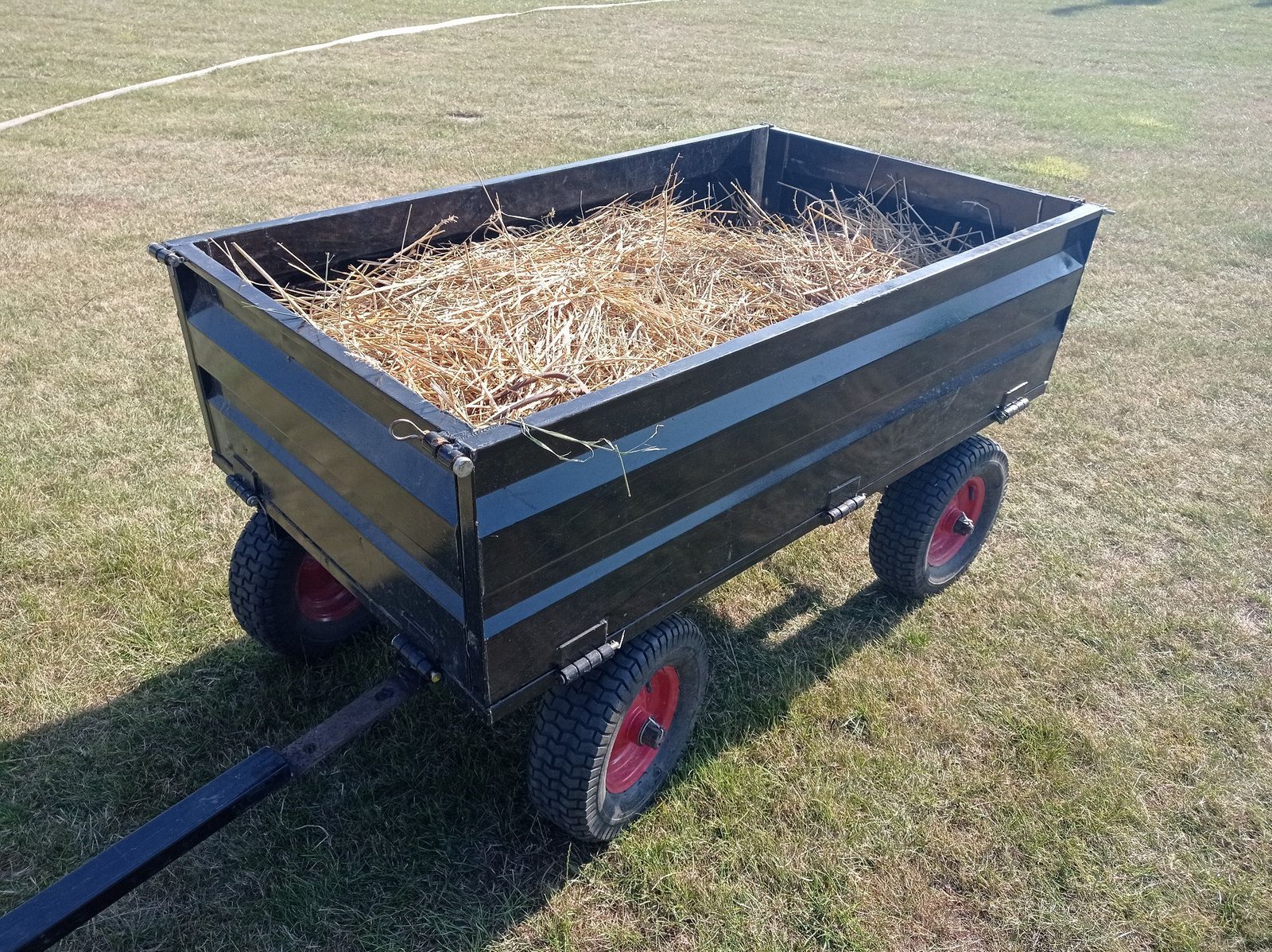Remorque en acier avec timon articulé et capacité de charge de 600 kg.
